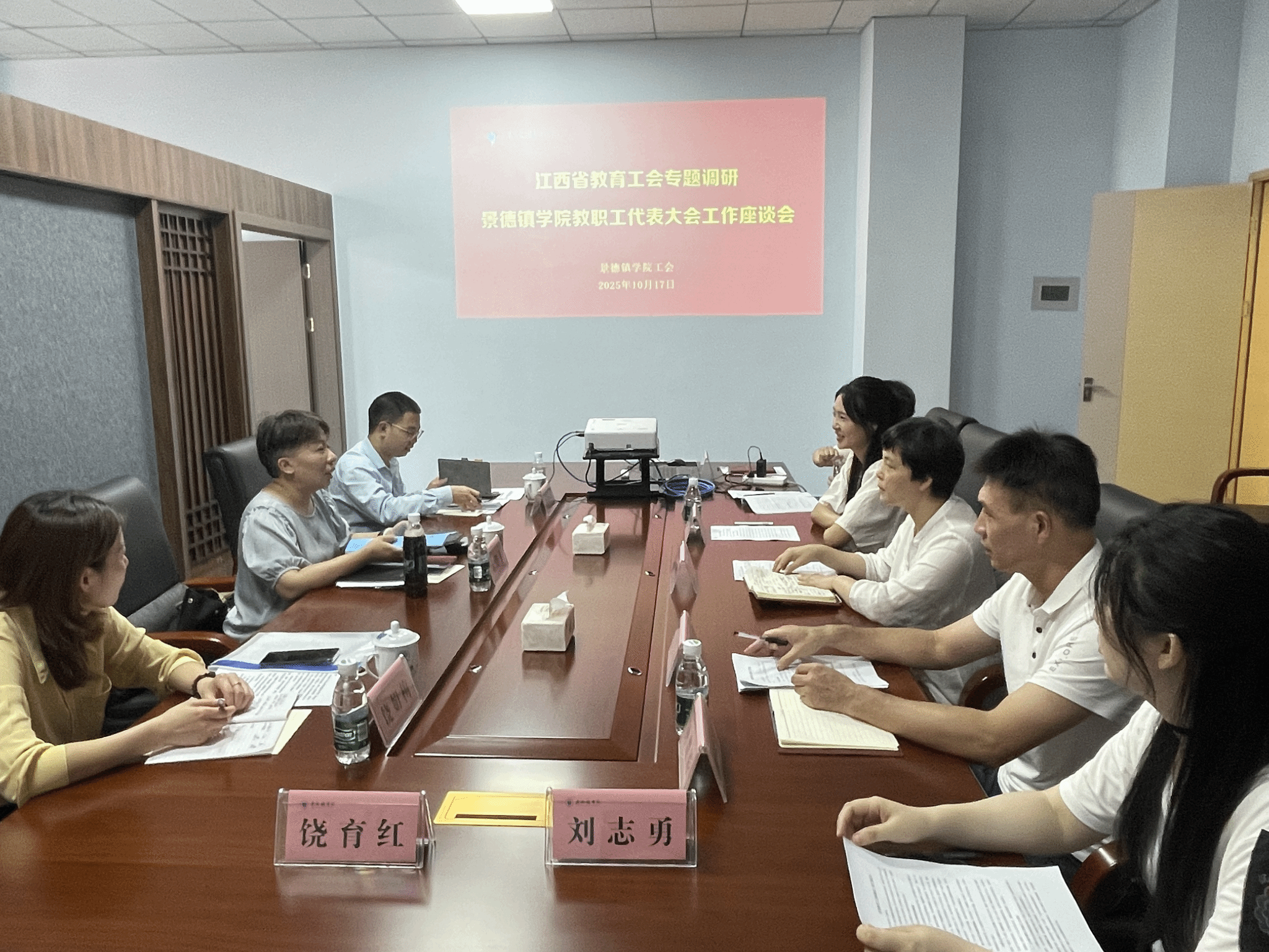 2025年10月17日,江西省教育工会主席、一级调研员宋懿非一行赴景德镇学院开展教职工代表大会(教代会)专题调研。景德镇学院工会全体成员、分工会主席及教职工代表参会,围绕二级教代会建设、校级教代会成效及工会服务创新等议题展开交流。